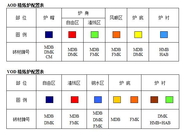 ●AOD 炉帽区工作衬:此处主要是经受机械应力损坏,可选择MDB或DMK系列产品,也可选择增强性浇注料。